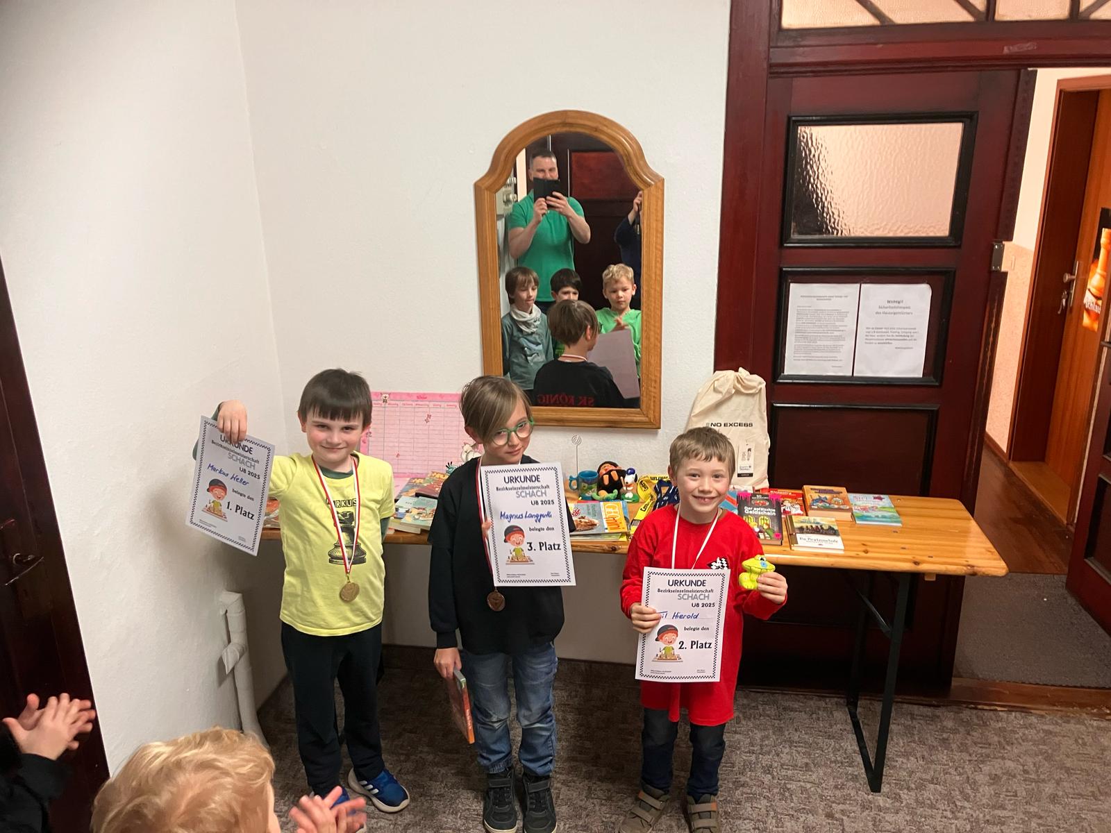 Freitag Nachmittag standen im KIEZ die ersten beiden Runden bei der u10 auf dem Programm. Unsere beiden Jungs starteten beide mit voller Punktausbeute und so kam es, wie es kommen musste. Bereits in der 3.Runde Samstagmorgen war das Duell gegeneinander fällig, welches Theodor für sich entschied. Die restlichen beiden Samstagsrunden sahen dann beide wieder mit 100% Ausbeute, sodass sie nach 5 Runden Platz 1 und 2 belegten. Sonntagmorgen gab's dann für Dmitrij eine Schrecksekunde, als er ein remisliches Endspiel einzügig wegstellte. Also musste in Runde 7 ein Sieg her und er lieferte, holte sich Bronze und die Quali zur SEM. Und was machte unser Theodor? Er gönnte seinen Gegner noch nicht mal ein Remis und holte sich mit 7 aus 7 den Titel und die Quali zur SEM.