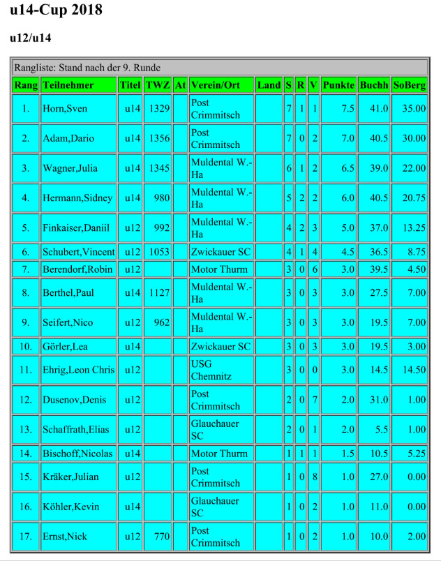 | 6. | 10. | Zwickauer SC IV | 3 | 3 | 3 | 9-9 | 16.5 | 42.50 | |||
