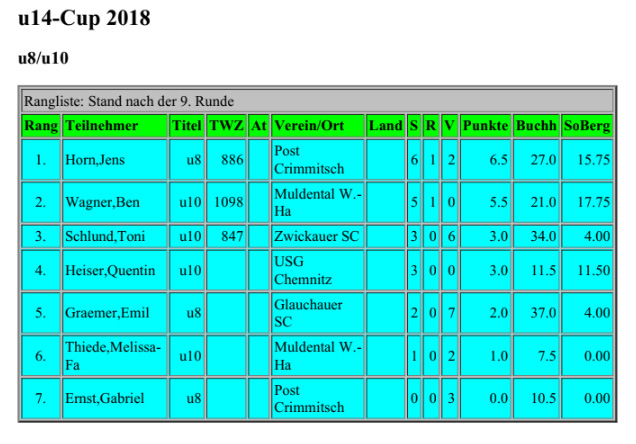 Am Samstag, den 16.06.2018 nutzten einige unserer Schachfreunde die Gelegenheit zur Teilnahme am 17.Chemnitzer Sparkassen-Schnellschachcup. Dabei wurden sehr ordentliche Ergebnisse jeweils im Rahmen der Möglichkeiten unserer Teilnehmer erzielt. Abschlußtabelle.