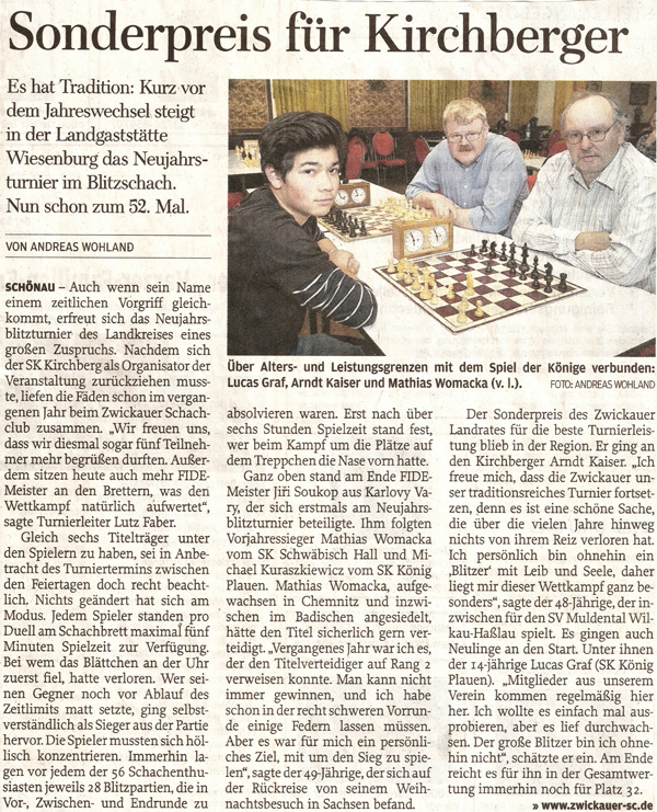 Am gestrigen Sonntag fand das diesjährige Neujahrsblitzturnier des Landkreises Zwickau in der Landgaststätte Wiesenburg statt. Bei wieder ausgezeichneten Spielbedingungen spielten 56 Schachbegeisterte jeweils 28 Blitzpartien in Vor,- Zwischen- und Endrunde. Wir konnten auf allen Gebieten (bei den Teilnehmern, Damen, Jugendlichen, Senioren und insbesondere in der Spitze mit 6 Titelträgern) sehr erfreuliche Steigerungsraten verzeichnen. Nach über 6 Stunden Spielzeit setzte sich FM Jiri Soukop aus Karlovy Vary vor GM Mathias Womacka vom SK Schwäbisch Hall und FM Michael Kuraszkiewicz vom SK König Plauen durch. Den Sonderpreis des Zwickauer Landrates Herrn Dr. Scheurer, der auch unser Turnier eröffnete, für die beste Turnierleistung holte sich Arndt Kaiser vom SV Muldental Wilkau-Haßlau. Ganz besonders bedanken möchten wir uns bei unseren Sponsoren, ohne die dieses traditionsreiche Turnier nicht möglich wäre, insbesondere bei der BIRKUS GmbH Chemnitz. Wir hoffen, im kommenden Jahr erneut auf zahlreiche Teilnahmen. Endergebnisse und Bilder.