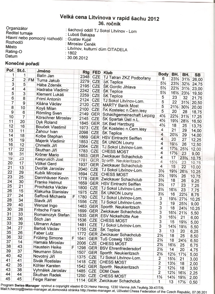 Seit Jahren gehört es zur guten Tradition, zum Saisonausklang das Schnellschachturnier in Litvinov zu spielen. Dieses Jahres waren sechs Schachfreunde des Vereines dabei und schlugen sich bei diesem stark besetzten Turnier durchaus achtbar. Endstand.