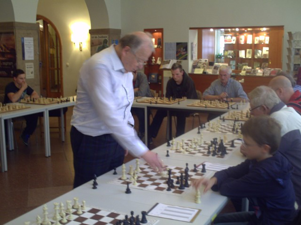 Am heutigen dritten Tag des Festivals des Sports wurde unserem Verein die grosse Ehre zu Teil, dass uns unser allseits bekannte und beliebte Grossmeister Wolfgang Uhlmann besuchte. Am Vormittag fand eine Simultanveranstaltung gegen Prominente und weitere Bürger unserer Stadt statt. Nach einer kurzen Einführung und Vorstellung schlug sich der mittlerweile 76jährige ausgezeichnet gegen die 14 besetzten Bretter. Er gewann 10 Partien, spielte drei Partien remis und verlor nur eine einzige. Nach seiner Teilnahme am Empfang der Oberbürgermeisterin stellte er sich dann den Vereinsmitgliedern zum Simultankampf an 15 Brettern. Verständlicherweise hatte er hier einen schweren Stand, nur zu einem positiven Score für unseren Verein hat es trotzdem nicht gereicht. GM Wolfgang Uhlmann holte sich 8 Siege, drei Schachfreunde konnten sich einen halben Punkt sichern und vier Zwickauer holten sich sogar den vollen Punkt. Abschliessend möchten wir uns ganz herzlich bei Wolfgang Uhlmann für diesen phantastischen Tag bedanken und wünschen ihm alles Gute insbesondere Gesundheit in seinem weiteren Leben.