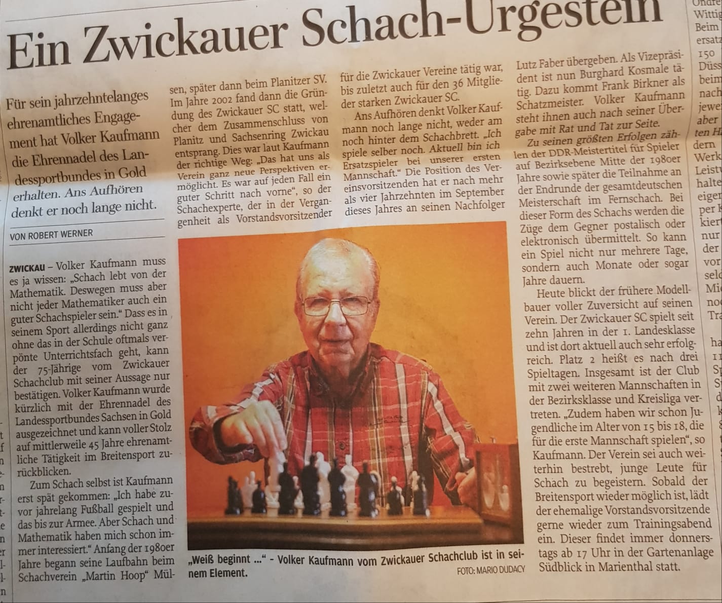 Wir haben Ende November und es gibt mal wieder gute und schlechte Nachrichten. Leider ist bis auf Weiteres der Trainings- und Wettkampfbetrieb bedauerlicherweise mal wieder eingestellt. Aber es gibt auch Gutes zu berichten in diesen Zeiten: Eine neue Schach-Elfe wurde geboren- Herzlichen Glückwunsch und alles erdenklich Gute. Und unser Volker wurde für seine Ehrung mit der Ehrennadel des Landessportbundes in Gold in der "Freien Presse" angemessen gewürdigt.