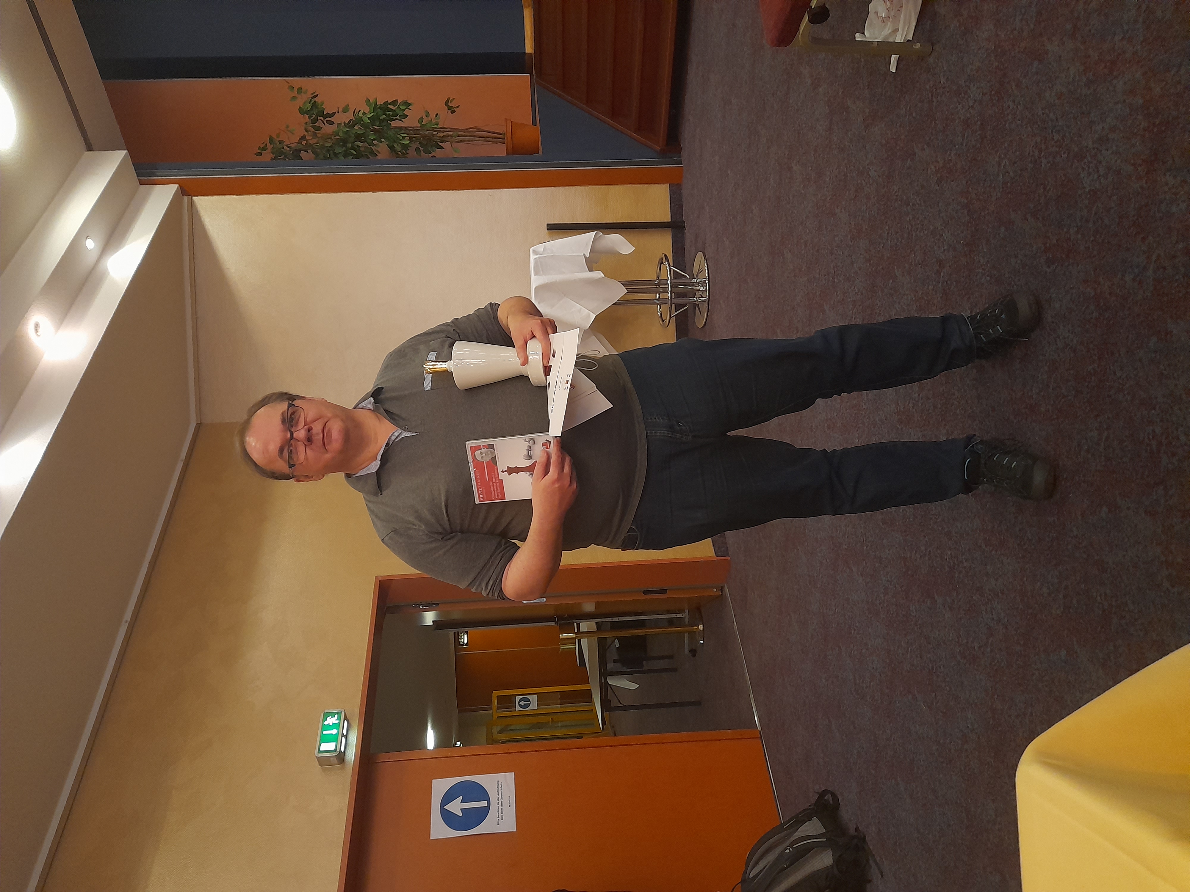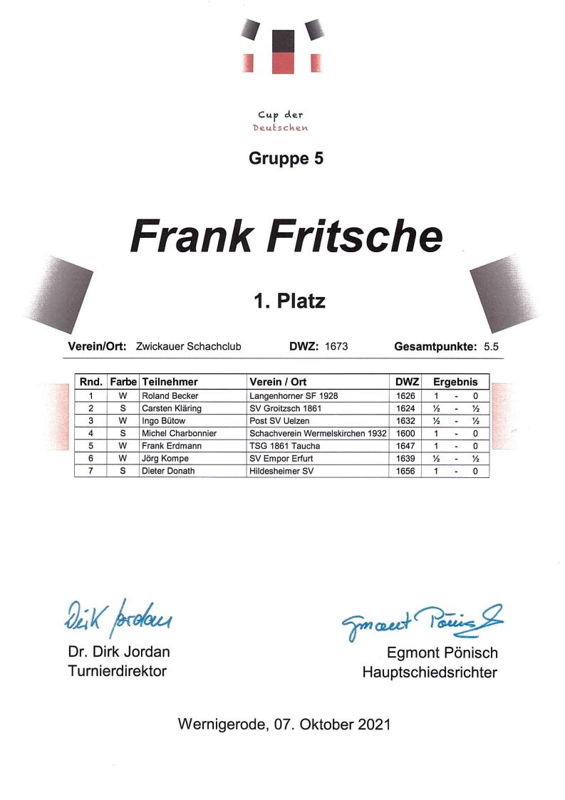 Wie schon seit Jahren wurden auch dieses Jahr die Tage um unseren Nationalfeiertag herum schachtechnisch mit dem Deutschland-Cup in Wernigerode gefüllt. Und dabei hat in diesem Jahr unser Frank den Vogel abgeschossen, unseren Verein sehr würdig vertreten und seine Wertungsklasse souverän mit 5,5 Punkten aus 7 Partien gewonnen. Ganz herzlichen Glückwusch!