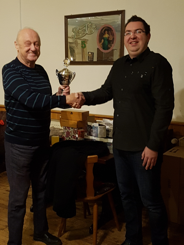 Freitagabend kurz vor Weihnachten ließ der Verein mit einer kurzen positiven Jahresbilanz des Vorstandes, dem traditionellen Blitzturnier und gemütlichem Zusammensein das Schachjahr 2018 ausklingen. Bei dieser Gelegenheit übergab Pokalstifter Jürgen Appel den Vereinsschnellschachpokal endgültig an Stefan Tunkel, der ihn nach dreimaligem Erfolg am Stück zu Hause in die Vitrine stellen darf.